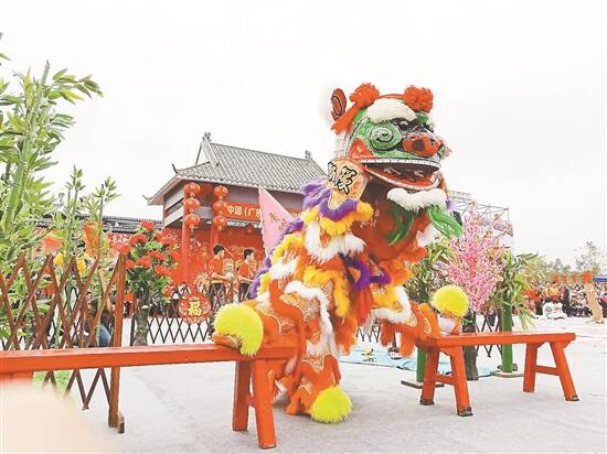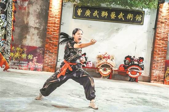 近年来,揭阳武术文化通过创新表达方式,实现了从传统到“破圈”的华丽转身。其中,青狮和英歌舞的表现尤为引人注目。作为揭阳武术与民俗融合的典范,青狮有着“青狮白目眉”“开口狮”的美誉。国家级非遗项目——揭阳青狮的代表性传承人孙淑强出身武术世家,其父孙振高是南枝拳一代名家,在改革开放初期重新开馆授徒,组建了揭阳第一支青狮表演队。孙淑强介绍说:“青狮的传统舞法有十八节,表演融合了武术、杂技、舞蹈等技艺,这些对表演者的基本功要求极高,自古就有‘未练舞狮先练武术’的说法。”从上海世博会到北京鸟巢,从世界潮人春晚到迪拜中国文化周,揭阳青狮舞出了一条精彩的文化出海之路。随着青狮影响力的扩大,孙淑强狮艺武术馆的培训班吸引了越来越多外地学员,生源地从本地扩展到江西、四川、河南、云南等地。“泼天”的流量不仅为青狮文化特色品牌发展创造新机遇,也为这座千年古城的文化旅游增添了新的动力。在孙淑强狮艺武术馆,以青狮为元素,将非遗传承与现代舞台艺术深度结合的情景剧《狮王争霸》每周在青狮大舞台精彩上演,如今已成为远近闻名、游客访揭必去的打卡点。