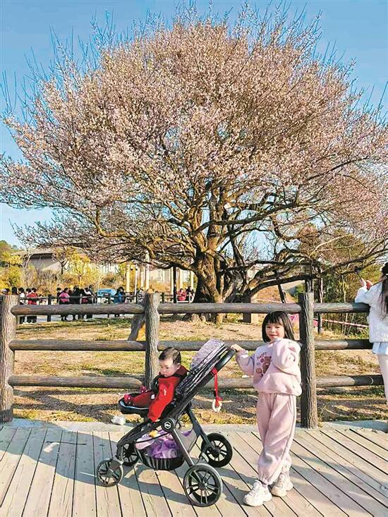 市民游客漫步花间,拿起手机、相机记录古梅风姿,孩子们在树下玩闹,笑声与花香一起荡漾开来。