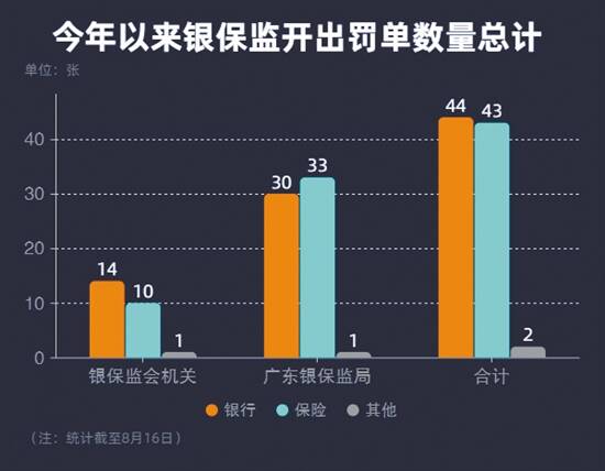 羊城晚报记者 戴曼曼 实习生 曾欣 黄楚萱 金融行业严监管的态势还在继续。此前有媒体统计数据显示,截至7月31日,央行对支付机构开出24张罚单,总额2.46亿元,超过单年历史记录。对银行和保险行业来说,监管同样没有手软。据羊城晚报记者不完全统计,截至8月16日,银保监会机关共开出25张罚单,总处罚金额达4472万元。从银保监局本级来看,广东银保监局共开出64张罚单,总处罚金额约为3128.1万元。 银保监会25张罚单罚没4472万元 严监管逐渐成为“常态化”。据羊城晚报记者不完全统计,截至8月16日,银保监会机关共开出25张罚单,共处罚了8家银行(注:各分行统计为一家,下同),9家保险公司(注:各分公司统计为一家,下同),总处罚金额达4472万元,其中对银行的处罚金额为2660万元,对保险公司的处罚金额为902万元。 记者梳理发现,多家银行罚单涉及EAST系统数据质量及数据报送的违法违规行为,包括资金交易信息漏报、分账户明细记录应报未报等问题,另外违反审慎经营规则的问题也是多家银行遭处罚的“重灾区”。而保险公司的罚单上多出现“虚列费用”“欺骗投保人”等违法违规行为。 银行方面,处罚金额单笔最高达630万元,另有4家银行的罚款金额均超300万元。保险方面,中国人民人寿保险股份有限公司、中国平安财产保险股份有限公司被处以百万以上罚款。 保险方面,“双罚”几乎成为例行规则,既对保险公司实施处罚,又对直接负责的相关人员给予行政处罚。中国平安保险股份、中国人民财产保险以及中华联合财产保险三家保险公司均被处以百万以上罚款,其中中国平安保险股份有限公司的个人罚款竟达到百万以上。 全国银保监局本级开罚单超过1000张 值得留意的是,今年以来,整个银保监系统开出最高金额罚单由上海浦东发展银行领到,被罚2100万元。不过,这一罚单却是并非由银保监会机关发出的,而是由上海银保监局开出。事实上,业内人士透露,从今年监管开出的罚单整体来看,大额罚单更多由银保监局开出,即分行比总行罚款金额要高,保险分公司比总公司罚款金额要高得多。 据不完全统计,今年以来,银保监局本级开出罚单超过了1000张。其中截至8月16日,广东银保监局共开出64张罚单,其中处罚了15家银行,22家保险公司,总处罚金额约为3128.1万元,其中对银行的处罚金额为1731万元,对保险公司的处罚金额为1392.1万元。 违规放贷等原因为主要被罚事由 从广东银保监局总体处罚情况来看,银行方面,违规发放贷款、贷后管理不审慎成为主要被罚事由。其中,农村商业银行成为重点监管对象,总计9家罚单指向了农商行系统,处罚金额达476万元。最大的一张罚单被广州农村商业银行股份有限公司白云支行领走,接近117万元,主要违规事由是“采用不正当手段发放贷款”。 此外,广发银行、光大银行的处罚金额超百万元,广发银行及其信用卡中心等收到罚单合计超过400万元。 对于广东地区的保险行业来讲,今年内收到罚单总计33张,涉及22家保险公司,总共被罚没金额多达1392.1万元。保险公司为何比较容易收到罚单?从被罚事由来看,“虚构保险中介业务方式套取费用”“给予投保人、被保险人合同约定以外的利益”“利用业务便利谋取不正当利益”三大内容成为被处罚的主要原因。 除此之外,广东银保监局还开出了两张终身禁业的罚单,主要违规事件涉及伪造金融票证,挪用客户资金。 [链接] 支付机构罚单动辄上千万 央行对支付市场监管力度持续加强,据相关媒体不完全统计,截至8月16日,央行已累计对支付机构开出41张罚单,罚没金额共计2.665亿元,其中28张是机构涉反洗钱违规被罚,累计被罚金额高达2.634亿元,超过此前最高的2018年全年罚单总额1.6亿元的纪录。 从前七个月来看,央行已开出5张过千万的罚单,其中商银信支付更收到一张过亿的罚单,罚单金额高达1.16亿元。