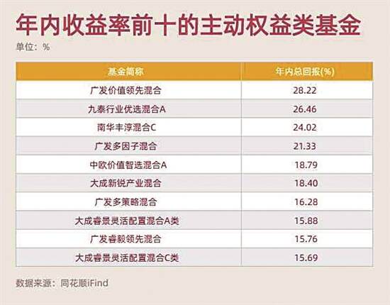 具体到单个基金,广发价值领先混合今年以来的平均收益率为28.22%,位居同类基金第一位;紧随其后的是九泰行业优选混合A,以26.46%的收益率位居灵活配置型基金的第一位,南华丰淳混合C、广发多因子混合,今年以来的收益率分别为24.02%、21.33%,排在前列。