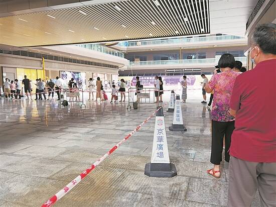 羊城晚报讯 记者景瑾瑾、曹月报道:6月1日起,南海区开展第二轮核酸检测。6月2日下午,记者前往南海区桂城街道灯湖社区的京华广场检测点接受检测。记者从开始排队到检测完毕,总共用时约1.5小时。 记者在检测现场看到,进入检测区域先要打开粤康码给相关工作人员查看。进入检测区域后,人群沿着广场步行街通道排队。虽然队伍较长,但排队的人们还是保持着良好的秩序,根据地面上张贴的间隔提示,相互之间保持距离,耐心等待。 同时,现场有多位工作人员及志愿者对排队的人群进行有序指引。