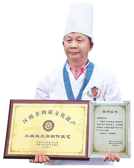 出品 佛山记者站 策划/统筹 谢红 文/图 羊城晚报记者 许张超 曹月 从废田筑塘到引水入渠,一口口望不尽的鱼塘盛产鱼类,印证着顺德人在烹鱼上的极致追求。在素有“鱼米之乡”美誉的顺德,吃鱼求鲜的传统和脍不厌精的烹饪,催生出了烹鱼技艺的更新。煮、炙、炸、蒸、甑、炒、烧、煎、炖、拌……一条鱼从鱼头吃到鱼尾,鱼身上下无一不可做成佳肴,一场全鱼席更是能摆设出136种菜品。 不是饺子,胜似饺子,凤城鱼皮角正是顺德烹鱼技艺的佳例。先将鱼肉摔打成鱼胶,再把鱼胶融入生粉,就制成了一种特殊的云吞皮,皮薄如纸却又结实耐煮,包好馅料下水后纹理清晰,犹如睡莲戏水。这一项顺德美食从清末民初传承至今,如今不但在珠三角各大城市及港澳销售,还远销美国、澳大利亚、新西兰、柬埔寨等海外市场。 2018年,凤城鱼皮角制作技艺被认定为顺德非物质文化遗产项目,欣得掌舵人区建恩被认定为凤城鱼皮角制作技艺代表性传承人。从民国时期的伦记酒楼,到改革开放后的恩德饭店,再到远销海外的欣得食品,区建恩不仅将外公陈永伦制作鱼皮角的技艺传承下去,更让这道顺德美食焕发出全新魅力。 百年沉淀 三代传承接力烹鱼技艺 “食在广州,厨出凤城。”一碗凤城鱼皮角,盛满了顺德人的饮食追求。从皮厚肉少的馄饨,到皮薄肉多的云吞,再到晶莹剔透的鱼皮角,由馄饨演化而来的鱼皮角如今已是驰名南粤的顺德小吃。最初,它是由顺德大良冯不记云吞面老铺以鱼皮取代面皮,推出爽滑耐煮的鱼皮云吞;其后,鱼皮云吞形状被改为扁平半圆形,鱼皮角遂告问世。 20世纪30年代末,区建恩的外公陈永伦在番禺开设伦记酒楼,鱼皮角正是酒楼当时的主打菜品。凤城鱼皮角的制作技艺,从外公手中传给父亲区林,再由父亲手中传承给自己,区建恩作为第三代传承人,正是在这种“食不厌精,脍不厌细”美食熏陶下,投身进厨师这个行业四十三年。 在德秀街河滨公园旁边,坐落着漆红门头、园林外围的欣得堂,这是以凤城鱼皮角为主题的非遗美食展览中心,也顺德餐饮食品行业首家博物馆。当记者走进欣得堂的时候,区建恩从旁边的体验馆过来,一问才知是匆匆停下手头备餐的活。从十六岁入行厨师,到如今事业有成,对区建恩而言,下厨做饭已经成为一种乐趣和享受。 “母亲把猪肉买回来、把鲮鱼宰好,爸爸跟着刮鱼青、打肉馅,我们在旁边一边帮着忙、一边学着做。”区建恩告诉记者,从七十年代初他开始跟着家里长辈学厨,选料、起鱼肉、刮鱼青、打鱼胶、擀皮、剁馅拌馅、包制、烹煮这些工序,在这种熏陶中鱼皮角的烹饪技法自然而然地做到了烂熟于心。 据介绍,鱼皮角选用的是“四大家鱼”中体型最小的鲮鱼,肉质细腻、富含胶质,起骨取出脊背肉后,以刀刃来回快速轻刮,刮肉起出鱼青,加盐后搅拌摔打至鱼肉起胶,鱼胶加入生粉擀皮包馅,角皮对折包成半月形,形似粉角的鱼皮角就出来了,干蒸、煎焗、放汤、火锅等均可。 在1985年创办恩德饭店的时候,区建恩在保留传统制作技艺的同时,对鱼皮角的馅料进行改良。从最初的鱼肉、猪肉,到加入芝麻、马蹄,再到加入鲜虾仁、大地鱼末和腊鸭肝,区建恩对鱼皮角的改良,既提升了鱼皮角的馅料饱满度,又使得鲜味更加香醇。目前,欣得食品针对韩国等海外市场,正在研制贴合当地口味的鱼皮角。 推广创新 顺德味道走向全球餐桌 “历遍风雨方可见彩虹,受过风霜方可见曙光……欣得美食美名远扬,鱼皮角香滑爽口,中西美点任君品鉴,情和爱倾尽一生,顺德美食走向世界。”在凤城鱼皮角博物馆里,区建恩向记者介绍着欣得食品的发展情况,在中间的墙面上印贴着一首由他填词的《欣得之歌》,不由得就用粤语唱了起来。 1978年,十六岁的区建恩在高中毕业后,直接去了当时位于容奇旧马路的大明酒家。从最初时候做楼面,再到进厨房当学徒,不久后他就开始跟着师傅做“到会”。区建恩告诉记者,到1981年的时候,他已经能够独立给生日宴、结婚、满月、乔迁等宴会做“到会”,国家逐步放开个体户经营后,就在容桂观音堂路口创办了恩德饭店。 “1988年,广州大同酒家的掌厨师傅们去旅游,在我这吃过鱼皮角后觉得可以当作点心餐和酒宴菜单的最后一道菜式。”区建恩说。每天早上六点就要起来,往摩托车尾架装上四箱鱼皮角,骑着摩托车送到大同酒店,十一点半回来后继续在店里掌勺。忙起来的时候,几个姐姐在午休收工的时候赶过来帮衬,父亲区林也逐渐成了专职的“收银员”。 1991年,占里食品和顺德食品进出口公司展开合作,鱼皮角从容奇港航运送到香港的客运码头。2002年,为打造符合国际生产标准的厂房,区建恩把占里食品迁址至新业路,并顺势将公司更名为欣得食品,取着“旗开得胜”“各取所得”的寓意。同样是在这一年,欣得食品成为广东省第一批通过HACCP(Hazard Analysis Critical Control Point)认证的食品企业,正式冲出亚洲、远销海外。而出口外销对食品安全标准的高品质要求,也为占里食品的发展提供了新动能。从香港到澳门,再到澳洲、美国、东南亚等海外市场,欣得食品在搭上海外销售的快车之后,从最初二十余人的小工厂变成了如今数百人的大企业,出口外销占总产量比例达到60%。 从上世纪八十年代第一个做速冻鱼皮角,到如今尝试推出麻辣鱼皮角,区建恩对于食品行业的求变求新、非遗美食的技艺创新保持一