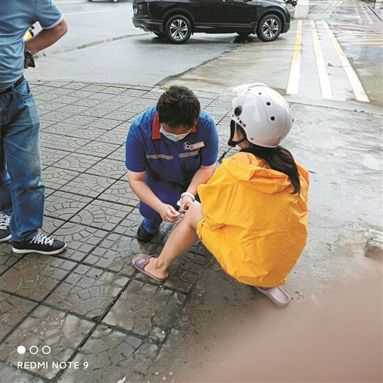 10月10日16时许,江门恩城加油站入口路上传来了“砰”的一声,一辆小汽车撞倒一辆电动自行车,电动自行车车主倒地受伤,正在加油作业的员工孔小玲发现后立即拿起药箱和“雪糕筒”冲过去救助。她摆放好“雪糕筒”后,指挥车辆绕道进站加油,小心扶起倒地腿部流血的伤者到安全地带止血,耐心安抚伤者并及时报警,又打电话告知伤者家属,直到交警到达现场处置才回到工作岗位。 原来伤者赶去幼儿园接小孩却被小汽车撞倒了,伤者家属到后见伤者并无大碍才安下心来,对油站员工的热心帮助感激地说:“你们品德高尚、乐于助人,中石化培训出这么好素质的员工,值得依赖和表扬。”现场的市民也纷纷赞誉,油站员工表示这是我们石化员工应该做的。 (文/图 冯国槐)