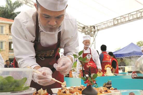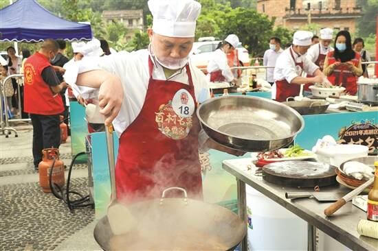 羊城晚报讯 记者梁正杰、通讯员谢婷婷摄影报道:10月30日,高明区2021百村名菜争霸赛杨和赛区选拔赛在大布村举行,来自杨和各村居的厨艺高手使出浑身解数,切菜、挥勺、热油、翻炒、调味,精湛娴熟的厨艺、细致认真的装饰及摆盘,让在场嘉宾和观众一饱眼福。 比赛现场,随处可见来自杨和的特色本土食材。来自大布村的厨师欧为强带来了自己的招牌菜——牛大力坚果浸鸡、坚果炆鸡。以坚果作为菜式的“点睛之笔”,欧为强认为这两道菜具有浓浓的“杨和味道”。“我们大布村的夏威夷果种植基地盛产夏威夷果,口感清香,这不仅是我们村的‘招牌’,也是杨和的特色农产品品牌。”欧为强说道。 拥有烹饪匠心的厨师,更懂得如何通过装饰、摆盘将一道菜的颜值提升。“发展美丽高明 手创幸福生活”,在这道名为“发财就手”的菜式上,厨师杜利初将黄瓜皮、橙皮等蔬果精心雕刻成一朵朵美丽的花,在视觉上增添了菜品的丰富性,也吸引了评委的目光。“第一眼就被震撼到了!这道菜不仅漂亮,还反映了乡村的新风貌。”广东粤菜产业发展促进会副会长张伟雄点评道。 在厨师们的精心烹制下,一盘盘色香味俱全的菜肴陆续出锅。沙姜鸡、豉油王猪手、松鼠鱼、糯米饭、狗仔鸭……令现场观众和评委赞叹不已。 这次大赛突出了杨和各个乡村的特点、风味,能够带动市民学习烹饪。使用的食材均出自杨和,也体现了杨和食材的健康、原生态。 经过激烈的比拼,来自清泰村委会的梁好娣获得本次比赛一等奖,叶勇广、钟小燕获得二等奖,温玉明、欧为强、麦丽芳、何让枝、梁富强获得三等奖,陈俊明、邓志军、曾志添、杜利初获得入围奖,以上12名获奖者与他们的获奖菜式将代表杨和赛区参加高明区百村名菜争霸赛总决赛。