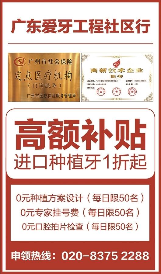 “广东爱牙工程社区行”正式发放高额看牙补贴,进口种植牙低至1折,上门即可获得口腔体检福包一份,享博硕学位种植名医亲诊,免挂号费、专家会诊费!预约热线020-8375 2288