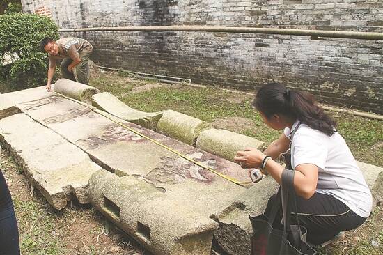 2013年文物工作者来测量鳌云书院牌匾(高明区博物馆供图) |