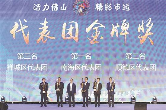 市运会上,佛山市委书记郑轲(左三)为五区代表颁发奖杯 |