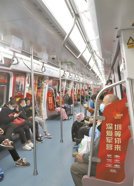 羊城晚报讯 记者李天军,通讯员廖祺红、王焕鑫摄影报道:满载报国豪情,开往军旅春天。虎年新春,以“深爱军营 圳等你来”为主题的福田区征兵地铁专列燃情上线,成为深圳市民过年的又一个打卡点。 两列春季征兵地铁1月30日正式上线,驰骋在7号线和9号线上。有不经意的邂逅,也有专程而来的打卡,春节期间,这两列征兵地铁成为深圳众多地铁列车中的“网红”,收获点赞一片。 热烈的“中国红”将地铁车厢装饰一新,“深爱军营 圳等你来”“正青春 一起拼”“热血男儿 志在军营”,一句句铿锵有力的标语鼓舞人心,一幅幅征兵海报中威武的军人英姿跃然眼前,一张张高清大图尽展福田士兵风采,牢牢吸住了乘客们的视线,让他们感受到正义之师的如虎军威和强劲脉动。 “一坐上这趟列车就被吸引住了,车厢内靓丽的中国红十分抢眼,年味十足,而且征兵内容饱含爱国之情,很有教育意义,非常喜欢这种既亲民又有新意的宣传方式!”陈女士一家户籍在华强北街道,除夕那天,陈女士收到街道武装干事在群里发送的“征兵专列上线”的新闻报道。“我是特地带着上高三的儿子来坐这趟列车的,为了坐上这趟列车还在地铁站等了半个多小时。我想让小孩感受一下军营力量,希望他高中毕业后能去军营历练两年再继续上大学。”陈女士直接用手机扫码登录全国征兵网,母子两人在列车上就开始了解各项征兵政策。 春节期间,福田地铁征兵专列还迎来了一批特殊的乘客——福田区历届优秀士兵代表。他们在部队服役时的照片被做成海报贴在了列车看板上。来自莲花街道的张创竣,2019年入伍,2021年荣获“优秀士兵”及嘉奖一次,2021年下半年退役后,入职某事业单位办公室。虽然已经退役,但他想起军营生活依然感慨万千。“当时参军是看到街道征兵办的宣传,自己也一直向往军营生活,就选择投入军营。这两年的部队生活让我真正成长为有责任有担当的青年,在思想上提升了责任感和荣誉感,同时部队刻苦的训练让我练就了强健体魄,这都是我人生的宝贵财富。”张创竣说道。 据福田征兵办相关负责人介绍,“戎装”地铁是福田区征兵宣传的一大创新之举,也是爱国主义国防教育的流动阵地,有助于激发更多鹏城有志青年的从军壮志,将爱国之心化为爱国之行。