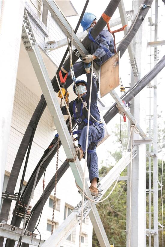 南方电网深圳供电局工作人员在110千伏雨虹输变电工程电缆终端塔施工 杨少昆 摄 |