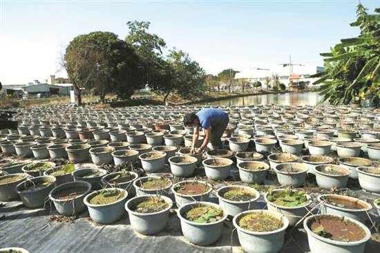 羊城晚报讯 记者秦小辉、通讯员农宣摄影报道:当前,气温逐渐攀升,光照充足,正是培育荷花的季节。19日,记者从东莞市农业农村局获悉,桥头荷花种植基地工作人员正忙着栽种荷花苗,预计50天左右可开花,确保荷花在6月盛放。 在桥头荷花种植基地,工作人员正翻出盆栽里的荷花苗、浮萍和杂草,挑选出优良粗壮的荷花苗,再重新种植在盆里,促进荷花健康生长。据介绍,盆栽荷花花期在一个月左右,为确保在荷花节期间盆栽荷花达到盛花期,桥头荷花种植基地工作人员通过控制种植时间,确保万盆荷花在荷花节期间完美亮相。目前正是种苗的好时节,种苗后预计50天左右开花。 据了解,今年桥头荷花种植基地将种植蝶恋花、中山红台、明媚莲等近400个品种约一万盆荷花。接下来,工作人员将做好除虫、除草、施肥等一系列养护措施,确保荷花茁壮成长。