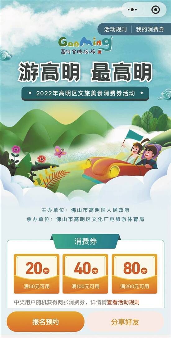 羊城晚报记者 梁正杰 通讯员 罗小君 为激发居民文化和旅游消费热情,营造良好的消费氛围,促进文化和旅游消费复苏,佛山市高明区文化广电旅游体育局计划举办2022年高明区“游高明 最高明”文旅美食消费券活动,并于5月15日20时开启预约价值600万元文旅美食消费券。这是高明区继前一天公布针对旅行社组织区外游客来高明过夜补贴100万元的举措后,再针对个人推出的促旅游消费大招。 消费渠道涵盖范围扩大 据介绍,“游高明 最高明”文旅美食消费券活动将发放文旅美食消费券共600万元,首批已于5月15日晚上开启预约,涉及多个文旅美食点。15日起,市民可通过关注“文化高明”微信公众号,通过菜单栏“最高明消费券”,进入官方指定领券页面进行预约登记,本轮消费券将在5月19日12时开奖。 与此前的旅行社补贴只适用于景点、酒店、民宿不同,本次消费券使用商户范围涵盖高明区内旅游景区、酒店、民宿、营业性电影院、“高明有礼”体验店、体育场馆、餐饮、书店等具备微信商业支付能力的规上文旅企业的线下商家或门店,使用渠道有所拓宽。 记者体验发现,登录“文化高明”微信公众号抽奖页面,输入“姓名”与“身份证号”后点击“立即报名”键,就会弹出“用于资格认定和奖券领取,请如实填写,确保报名有效”的信息。出现报名成功的消息提醒后,点击“接收中奖通知”对话框, 允许“发送消费券中奖通知”,即可订阅中奖通知提醒。 成功抽中的市民,即可获“满200元减80元”“满100元减40元”或“满50元减20元”的消费券(抽中随机可获其中两张),到高明区指定文旅商户消费达到一定额度,即可立享优惠。 广佛常住市民均可参与抽奖 只要是佛山、广州的常住市民,就可以通过识别手机定位至佛山市或广州市,即可预约本次“全域旅游-最高明消费券”。报名时间为5月15日至6月2日12时前。第一轮开奖时间为5月19日12时,未中奖的用户自动参与下一轮抽奖,第二轮开奖时间为6月2日12时。公布后可查看是否抽中,每个用户最多可中奖一次,中奖后消费券自动进入微信“卡包”。 实际使用时,消费券需到线下实体商户门店和经营场所进行消费,并在线支付时方能使用,每笔消费限用1张消费券,一次性全额使用,不找零,不得用于充值、预存等消费。使用消费券的同时可以享受商户提供的其他优惠活动。 需要注意的是,本次活动的消费券有效期为10天(且不超过单个发券周期),截至最后一天23时59分59秒,逾期失效。消费券原则上实名领取并使用,不可拆分、不可提现,不可转赠、转让他人、不可为他人付款,不可售卖。
