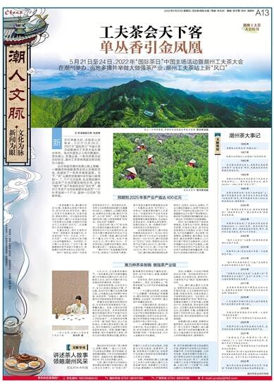 文/羊城晚报记者 蚁璐雅 新芽吐翠春光好,诗画茶山迎客来。5月21日至24日,2022年“国际茶日”中国主场活动暨潮州工夫茶大会在潮州举办。海内外爱茶之人将共聚潮州、登凤凰山、把盏品茗,一系列茶事活动异彩纷呈,潮州工夫茶将再度惊艳亮相世人眼前。 站在绵延的潮州凤凰山脉上俯瞰,一圈圈茶树细数着历史悠久的潮茶文化,也铺就了一条条幸福致富路。当下,“茶”元素贯穿着潮州乡村振兴脉络和一、二、三产业全链条,扎实推动潮州迈进茶产业高质量发展的步伐,这枚“绿叶子”成了名副其实的“金叶子”,潮州工夫茶产业的发展路径也成为“一片叶子成就一个产业,富裕一方百姓”的新样板。 预期到2025年茶产业产值达400亿元 一抹茶香飘千年,椐《潮州府志》记载,凤凰单丛茶始于南宋末年,至今已有900多年历史。潮州工夫茶不仅是粤东的,也是中国的,更是世界的。作为国家级非物质文化遗产,潮州工夫茶是先祖留下的宝贵文化财富,也被称为中国古代工夫茶的“活化石”,沉淀着悠久历史和厚重文化。 在潮汕地区,茶叶又被称作“茶米”,茶就像米、甚至重于米,许多老百姓“宁可一日无米,不可一日无茶”,一杯工夫茶早已成为潮人生活的重要部分。与此同时,万千潮人以茶会友,广交天下客,儒雅精致的茶艺串起千年潮文化,筑起潮州与世界优秀文化交流之桥。 茶叶广受欢迎,坊间广为流传的茶传说可不少。相传南宋末年,宋帝卫王赵昺南逃路经潮州凤凰镇的乌岽山,口渴难忍,山民献红茵茶汤,赵昺饮后生津止渴,赐名为“宋茶”,后人称“宋种”。还有“凤凰鸟闻知宋帝口渴,口衔茶枝赐茶”的传说, 因此又称“鸟嘴茶”。 正是在这种“高人气”和本地茶山资源的双重优势加持下,潮州茶渐渐迈开产业化发展的步伐,逐步成为潮州最具特色的农业产业之一。今年第一季度,潮州全市茶叶产量达0.75万吨,实现产值18.28亿元,同比增长20.1%。许多茶农脸上挂着丰收的喜悦,绿水青山真正成了一座座金山银山。 “潮州作为广东省最著名的茶叶产区,培育出了自然香气清高、香气类型丰富的珍稀高香型名茶——凤凰单丛(堪称‘茶中香水’),孕育出了底蕴深厚的潮州工夫茶文化。”在国家茶叶产业技术体系清远综合试验站站长、广东茶产业联盟理事长操君喜看来,在全国众多茶品类中,凤凰单丛特色鲜明、发展空间巨大,是一张最能代表广东特色茶文化的亮丽名片。 站在发展的新风口,潮州将如何擦亮这张金名片?在2021年印发的《潮州市千亿农业产业发展方案(2021—2025年)》中,潮州坚定提出“四百亿”目标:预期到2025年茶产业产值达400亿元,其中第一产业产值110亿元,第二产业产值150亿元,第三产业产值140亿元。 为此,潮州提出要在推进单丛茶特色化、优质化、生态化、品牌化、产业化建设的基础上,发挥“中国乌龙茶之乡”“中国岭头单丛茶之乡”“中国重要农业文化遗产”等名牌效应,推动茶产业跨越式高质量发展,走出一条生态、可持续的产业发展道路。 同时,该方案敲定多个具体发展维度,在调优生产结构、擦亮金字招牌、打造多元茶业、坚守安全底线等四大方面推出16条工作措施,在产品质量提升、龙头培育、标准管控、品牌建设、数字建设、社会服务、融合发展等方面着力,以大项目落户带动产业链延伸,以扶优扶强重点企业夯实产业基础,以数字化引领驱动茶叶产业现代化,推动茶产业跨越式高质量发展,为实现乡村全面振兴提供有力支撑。 聚力种养采制销 做强茶产业链 4月14日,正当春茶采摘时节,一场凤凰单丛茶产业高质量发展工作专题会在潮州召开,吸引无数茶人目光,成为今年潮州茶产业发展动向的晴雨表、风向标。 “坚持系统思维,立足百年大计,全力以赴做大做强生产链、产业链,坚决打好打赢产业发展关键之战,让凤凰单丛金字招牌打响全国、走向世界。”专题会上,潮州市委书记何晓军掷地有声地提出。 带着丰收的喜悦和政策的利好,许多茶农和茶商都铆足干劲,勇攀凤凰山。但是,记者在走访茶农和茶企时发现, 多种传统制茶模式的弊端仍常见于家庭作坊式生产,如不同茶农种茶、采茶、制茶工艺的标准不一,许多制茶老师傅心中有一套“独家”程式,加上产品标准化、机械化普及程度不高,因此,茶叶采摘和加工品质常与茶农经验息息相关。再者,随着产量日渐提高,茶叶采摘季用工紧张、劳动力成本增加等情况加重,都极大影响着茶叶的稳定产量和品质。显然,这不利于做大、做强、做精茶叶产业链。 总体而言,茶叶品质应是产业发展核心。因此,在专题会上,“种养采制销”五大环节自然被提到重要位置。 ——不仅要生态种茶,全域推广“山顶戴帽”“坡穿袈裟”种植模式;要科学养茶,对古茶树实施挂牌管理、立法保护、科学养护,建立茶叶质量检测机构。 ——还要合理采茶,坚决防止过度采摘,产教融合培育储备本土采茶技师;要规范制茶,坚持标准化生产和分等级管理双向发力,充分发挥联营公司和行业协会作用,通过科学拼配技术推出标准化、高品质的中低山茶叶产品。 ——更要精准销茶,建立茶叶交易市场、专业仓储中心、商贸市场,研究构建年份茶产业体系,持续完善“四统一”标准化体系,为引入金融活水夯实基础。 然而,依靠第一产业的产销带动远远不够。如何盘活茶的全产业链条,充分发挥主体、客体作用,才是特色产