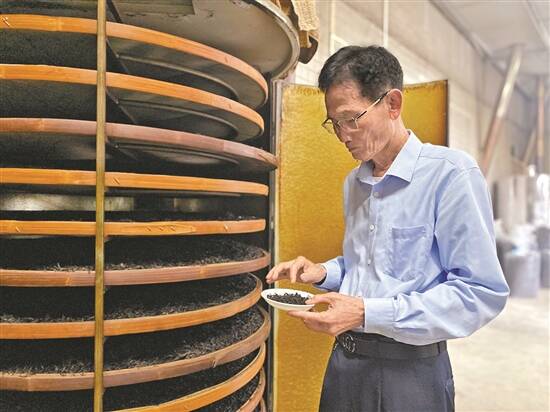 王金良查看茶叶烘焙情况 赵映光 摄 |
