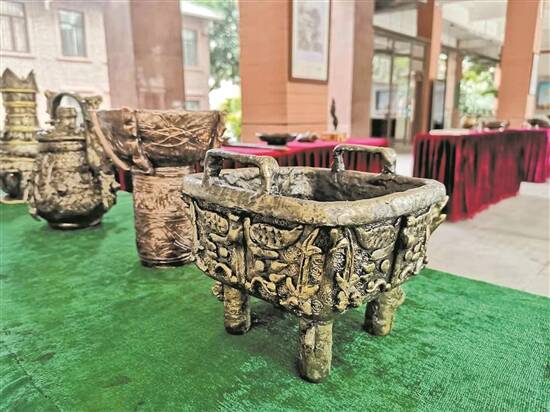 铜剑、酒器,三星堆面具,还有一尊司母戊鼎,在协和中学的一间教室里,整齐地摆放着一件件“青铜”物件,它们色泽逼真,样式精美,还有专门打磨出的“锈迹”,若不是在手中把玩顿觉分量颇轻,很难用肉眼将其与真正的青铜器区分开来。