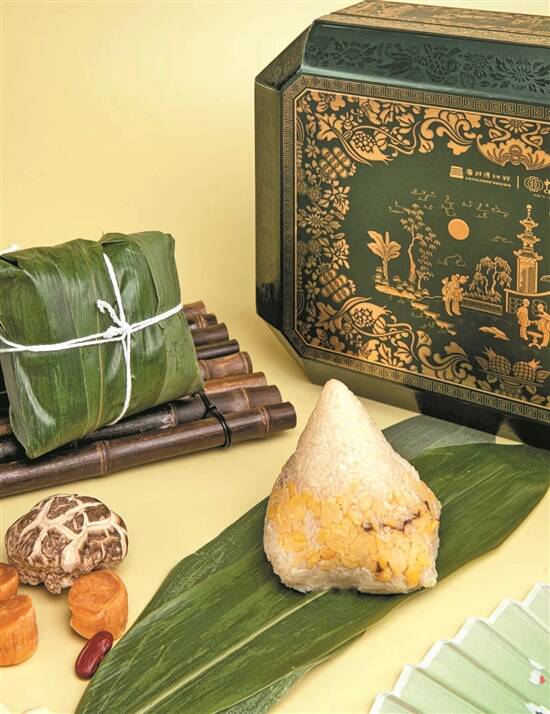 由广州博物馆与中国大酒店联手推出的文创粽子礼盒,在工艺上采用了广东著名的黑漆描金技法,盒面在单色漆地上加描金色花纹。礼盒包装蜡纸上则借鉴了广州博物馆馆藏“龙舟竞渡”通草画的元素。“龙舟与端午节相互呼应,描绘出独具岭南特色的龙舟竞发、锣鼓铿锵的热闹场面。”广州博物馆副馆长朱晓秋道出了礼盒设计的寓意。