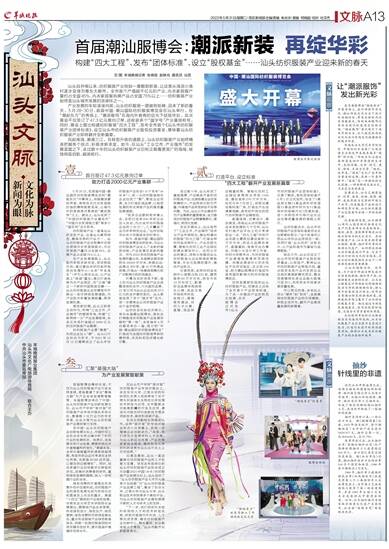 在首届服博会“潮起东方”开幕秀场上,设计师将中华文化、潮汕传统文化与当下流行时尚相结合,带来全新的内衣家居服款式,传统戏曲服饰元素结合现代时装更是惊艳全场,“潮派服饰”再次吸引了海内外的关注,让人