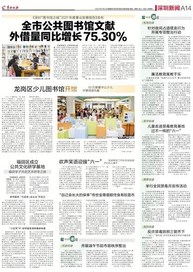 羊城晚报讯 记者郑明达报道:在第34届图书馆服务宣传周来临之际,深圳图书馆、深圳图书情报学会联合市、区图书馆共同发布《深圳“图书馆之城”2021年度事业发展报告》,全面总结全市公共图书馆20