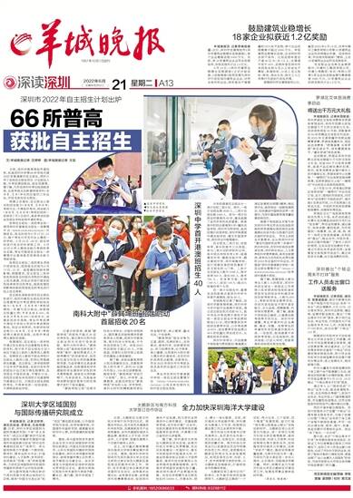 文/羊城晚报记者 沈婷婷 图/羊城晚报记者 王磊 日前,深圳市教育局发布通知称,批准深圳中学等66所学校开展2022年普通高中自主招生,同时公布了各校自主招生项目、计划招生人数、