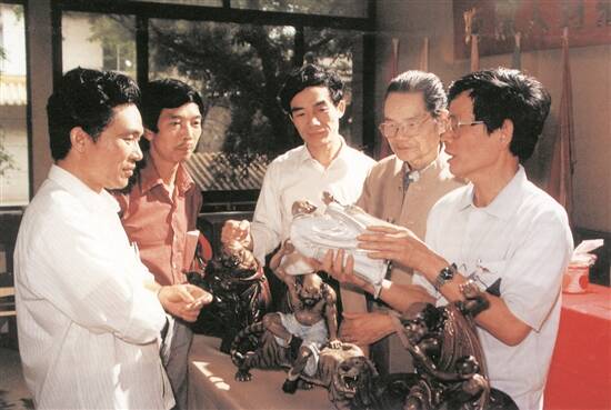1988年红狮牌石湾陶塑人物再度荣获国家金质奖。图中人物从左至右:刘泽棉、梅文鼎、蔡波、刘传、庄稼 |