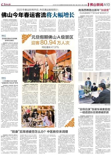 羊城晚报讯 记者景瑾瑾、通讯员王雪报道:1月4日,记者从佛山市文广旅体局获悉,在刚刚过去的元旦假期,佛山全市文旅活动精彩纷呈,元旦节假日三天,全市A级景区累计共接待游客80.94万人次,按可
