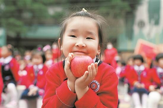 烟墩路幼儿园开学典礼上,学校给小朋友们送上苹果 图/羊城晚报记者 梁喻