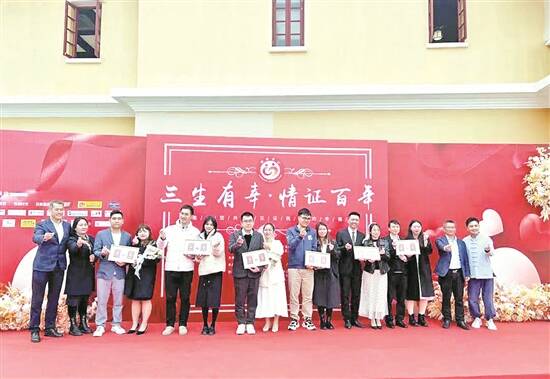 羊城晚报讯 记者梁正杰、通讯员曾苑珊摄影报道:2月14日,三水区“三生有幸·情证百年”主题活动暨婚庆产业主题展在河口百年车站主题公园举行,162对新人在浪漫喜庆的氛围中办理结婚登记。 当天上午10时,活动正式拉开帷幕。活动现场幸福满溢,弥漫着甜蜜的味道。男女对唱《想要对你说》《与你到永久》、古筝表演《梦华》《爱你》、萨克斯表演《Beautiful》《know you by heart》、女声独唱《告白气球》等精彩纷呈的节目轮番上演,为新人们送上最真挚的祝福。 结婚登记集体颁证仪式将活动拉向高潮。6对新人代表缓缓走过红毯踏上舞台,在众多亲友和市民的见证下宣读《结婚誓词》,许下对彼此的终身承诺,由协办单位代表担任颁证人为新人们颁发结婚证,并送上了幸福大礼包,给新人留下深刻的美好回忆。 据介绍,自2022年5月三水区婚姻登记处迁至河口百年车站主题公园以来,三水区民政局主动作为、积极谋划,以百年主题为核心引擎,联动各方资源,探索促进婚庆及相关产业有序良性发展。2023年,“打造百年火车站婚庆产业集聚区”写入政府工作报告,被列为区政府重点工作。本次“三生有幸·情证百年”主题活动暨婚庆产业主题展的举行,充分彰显区民政局借助主题活动为契机,搭建婚庆资源集中展示平台,点亮百年车站浪漫特色,充分发挥平台对婚庆产业发展的杠杆撬动作用和磁石吸引作用,推动婚庆产业高质量发展的信心决心。 三水区民政局相关负责人表示,未来,区民政局将携手区婚庆产业协会不断推进婚姻登记与婚庆产业有效衔接,进一步整合婚恋、文旅、消费服务等婚庆上下游优质企业资源,推动建设“婚庆产业基地+婚庆产业上下游业态+百年好合广场+文创市集”等主题街区,为市民群众提供更专业、更独特、更高品质的婚庆全链条服务。通过打造一个集文旅资源、特色非遗美食、婚庆产业聚集、文化传承等多功能为一体的婚姻文化消费集聚地,丰富婚恋消费场景,创造消费热点,持续释放消费潜力,为推动三水区经济发展注入“幸福力量”。