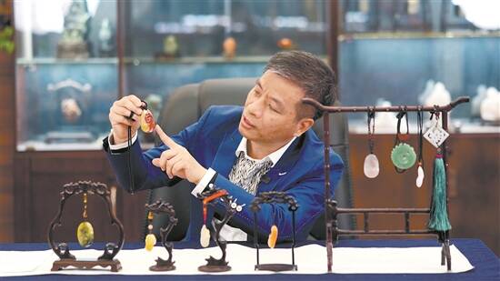 一手持原石,一手执雕刻机,依着白描图案在工作台上精雕细琢,一笔一划中图案轮廓渐显,灵气渐现,一块朴玉就这样被赋予生命,成为一件凝结了工艺美和文化寓意的艺术品。