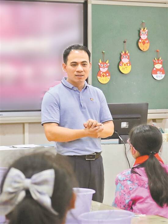 文/范彬彬 图/受访者提供 “为什么一定要像?毕加索、莫奈的画与实物像与不像,也是有差距的。”“我们不只是培养美术的技,还要弘扬真善美,塑造美好心灵。”“每一个孩子都需要关注,艺术的评价是多维的。”在与东莞市青少年活动中心副主任何振环的对话中,他通过自己的教学经历、实践案例,生动地讲述着美育在孩子健康成长中的作用。 充分挖掘美育资源 因地制宜开展学校美育 “那时候周围有人建房子,我就捡那些挖掘机挖出来的深层的土,处理一下带学生们一起做陶艺。”“学校附近有一条被污染的河涌,我就带他们去看,然后再去田间写生,直观感受。”早在2002年,何振环刚毕业参加工作,在东莞市石碣镇的一所村小担任美术老师,那时的他就喜欢观察环境,尽自己所能充分利用教学资源,希望给孩子带去更多更丰富的美术课程体验。 何振环不但是东莞市青少年活动中心副主任,也是中小学美术高级教师,还是广东省特级教师、南粤优秀教师、东莞市教育家型校长和教师培养对象、东莞市中小学名师工作室主持人、东莞市优秀教师、东莞市美术学科带头人、东莞市教育科研先进教师、东莞市优秀少先队辅导员,岭南版《美术教学参考》编委。 随着教学经历的增长,他拥有了越来越多的头衔,但始终不变的是,他还坚守在教学一线。“每一堂课都是一次探索。”对于何振环来说,上课不只是培育学生,其实也是在推动教师成长。进入新时代以来,我们国家大力推进“五育并举”,美育强调面向全体学生,尊重学生的个性化和差异化,“我们要了解每一个学生,每个学生在美术上都有不同的表达。美术教育的目标也是培养人。”何振环强调,美育并不等于美术知识与技能培养,应该将其作为培养人终身必备品格的关键一环。并且,还可以把地域和学校的自然条件与人文历史资源结合起来,建设将生态之美、社会之美和艺术人文之美等融会贯通的特色美育课程。充分利用优势资源,开发具有地域文化特色、专业特色的美育课程。 打破单纯的学科本位 探索美术跨学科教学 “为什么长大了很多人就没那么喜欢画画了?因为你被‘像不像’困住了。”“为什么一定要像?毕加索、莫奈的画与实物像与不像,也是有差距的。”何振环说,大众对于美术作为一门课程,有时候过度地强调了知识与技能,反而忽视了美术本身作为艺术的一种,具有的表达、传递和育人的作用。 “培养人是一件需要坚持的事,一些良好习惯的养成能受益终生。”何振环说,今天的美育,同样贴近时代问题。新科技革命已经使部分智力劳动可以被替代,传统的知识教育和技能培训受到很大冲击。能够给人以丰厚的感性、丰沛的情感、丰富的想象力和创造力的美育,在新文科和新工科等新一轮教育革命中更能发挥其独特的作用。 “越来越多的学科分科需要孩子们付出更多的时间精力,如何提升学习效率也是减负关键。”一直以来,我国新文科建设、新工科建设等都强调学科交叉融合,关注复合型和创新型人才的培养。何振环说:“有一次,学校数学老师跟我说,给学生们讲立方体的体积问题的时候,他们很难理解,问我有没有什么好方法,我就在美术课上给孩子们讲了透视学,画透视图,效果非常好。”据何振环介绍,早在2001年颁发的《义务教育美术课程标准(实施稿)》中,为强化综合性学习,引导学生积极探索美术与其他学科、与社会生活相结合的方法,进行跨学科学习活动,其中就特别设置了“综合·探索”学习领域。所以一直以来,在何振环的课程教学设计中,他都在不断地摸索实践着“美术+语文、美术+数学、美术+N”的教授方法,并取得不错的成果与效果。 用美术生态教育理念 构建少年宫美术课程体系 “美术生态教育突出‘生态、绿色、自然美、生态链’四个特点。”何振环介绍,美术生态教育简单来说,就是以美育人,开展以美术教育为主题的跨学科教育教学和课外校外实践活动,提高学生审美和人文素养;以美术学科知识为主,渗透其他学科知识,美术知识占80%以上,其他学科知识占20%以内。 从2002年解决小学“美术+生态环保”问题开始,何振环一直没有间断对于美术生态教育的研究实践。直至2016年进入东莞市青少年活动中心工作,发现少年宫没有规定的教材,何振环在小学开展美术生态教育探索14年的基础上,在青少年活动中心开设美术生态教育项目,开始研究少年宫“美术+”的美术生态教育课程构建。 “国家没有制定少年宫的教材和课程。”何振环介绍,少年宫(包括青少年活动中心、青少年宫、学校少年宫)是教育机构,属基础教育范畴,是中小学教育的补充与延伸,但美术作为少年宫主要学科,国家并没有制定少年宫的美术教材、课程。“但一线老师都是需要教材的,不然教学缺乏系统性。直接影响教学质量。”为此,结合项目研究,经过1000多节课的课程实施与检验,何振环与其项目团队研制出了少年宫美术生态教育课程HASP模型(课程设置等级化、特长培养进阶化、技能提升专业化、教学内容项目化)。 “我们结合课程模型形成课程内容和教学方案,让上课的老师们可以直接拿来用,这样上课也会更有科学性、系统性和可操作性。”何振环说,课程体系的推出,能够直接解决少年宫老师的上课问题。并且,他们还将少年宫“美术+N”课程研究成果进行实践检验和推广应用,通过持续地对
