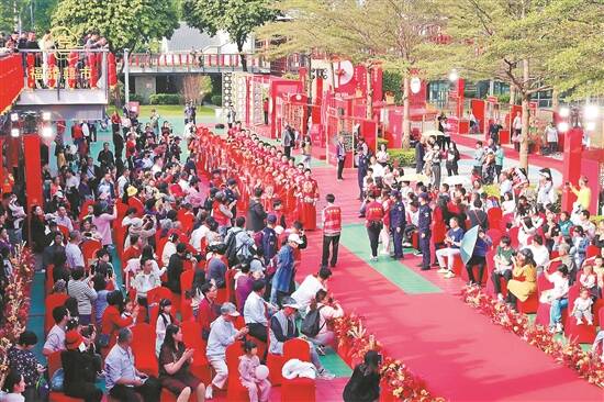 羊城晚报讯 记者郑明达报道:执子之手,与子偕老。1月6日,福田区2024年度首场“福甜囍市”婚姻主题市集在充满幸福气息的香蜜公园甜蜜举办。为庆祝即将到来的第四个“中国人民警察节”,福田区委、区政府特别安排了“警”此一生集体婚礼专场,为深圳市公安局福田分局的16对新人送上甜蜜祝福。 本次活动由福田区民政局和香蜜湖街道办事处联合举办,不仅是福田区传承婚俗传统文化,打造全省婚俗改革实验区的创新尝试,也是深入实施“百千万工程”,实现更高水平“幸福福田”的具体实践。 “你们,一方是‘警察’,为了人民公安为人民的承诺,义无反顾、坚守一线,奉献‘小我’、成全‘大爱’;一方是‘警嫂’,无私奉献,倾心支持公安事业,军功章有你们一半。”深圳市公安局福田分局政委吕周海致辞,为新人送上美好的祝福。 现场,16位身着警礼服的警察英姿飒爽、潇洒帅气,一身红艳秀禾服的新娘明艳动人、温柔美丽。挽手礼、跨马鞍、拜天地、交换信物……集体婚礼每一个环节都有满满的仪式感。 “看到爱人穿上中式秀禾服,又一次被惊艳到了,此刻她就是最美的新娘。”参与集体婚礼的公安民警朱先生说,爱人一直以来对他的工作毫无保留地支持,从没有任何怨言,让他非常感动。这对甜蜜的新人也表示,能来参加这次集体婚礼非常激动,特别感谢福田区委、区政府,还有所有工作人员的努力,举办了这么一场别开生面、意义非凡的婚礼,让他们感到无比温暖、浪漫和幸福。“在今后的日子里,我们在守护好家庭的同时,定将一如既往以人民为中心,立足岗位,忠诚履职,努力投身公安事业发展,为建设幸福福田贡献自己的力量。” 主办方在活动现场设置有红树林保护宣传展板,呼吁市民保护和维护宝贵的红树林生态。“我诚挚邀请每位在场的嘉宾,与我们一起护红树成长,守家庭幸福,小家汇聚大爱,共建绿美福田、绿美深圳。”在活动的尾声,主持人向全场发出保护红树的倡议。 截至当晚9时,市集摊位共吸引了近5万人次的市民参与其中,意向成交约1.6亿元,如福田房企坪山项目现场摊位有53对新人和市民预约看房并表达了购买意向;宝格娜婚纱现场成交或达成意向118人;雅枫国际酒店酒席成交或达成意向16人,进一步撬动福田区“甜蜜经济”新增长,刺激婚庆市场新消费。