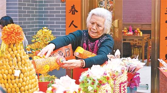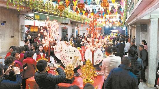 文/羊城晚报记者 杨锦强 图/周婷婷 刘静静 每年农历正月十六,惠东县平海古城内的北门大街都挂满彩旗,红桌子从街头摆到街尾,桌上摆满村民精心制作的手工艺品或是各类摆件,供人欣赏、点评。原来,这就是平海镇平海社区西北村一年一度的摆盘盛会。 相传,平海摆盘是从明朝相沿至今,已有600多年历史。最初的摆盘是城内百姓为了庆祝抗倭将士凯旋,自发在大街上摆放果、酒、肉等食物犒劳将士。久而久之,平海形成了当街集中摆放各种手工艺品、摆件,以此进行庆祝、祈福的独特风俗。 近年来,平海摆盘备受人们的喜爱,已成为平海古城的一道靓丽风景线。同时,这项传统民俗活动也逐渐受到当地年轻人的关注,并且积极投身参与其中,不仅在形式上更富有创作艺术性和生活气息,还在创新与传统碰撞中接力传承。 百盘“盘景”异彩纷呈 正月十六,记者从惠州市区驱车出发,一个半小时左右的车程便可抵达平海古城。沿着古朴的街巷前行,不一会便来到了举行摆盘活动的古城北门。 首先映入眼帘的是挂满彩旗的城墙,瞬间将人带入了充满喜庆和热闹的节日氛围中。随后便是数十张红桌子在城门下的街道上呈一字形并排展开,桌子标有各条街巷的名字,且每条街巷有标定桌数。 下午3时左右,平海镇平海社区西北村的村民按照街巷对号入座,陆续将自己精心制作的手工艺品盛在盘子里,摆放在桌上。今年76岁的林九妹参加摆盘已有30多年,依旧心灵手巧,做了12个手工艺品。“这四个是‘国泰民安’,里面是泡沫碗,将一颗颗莲子粘在上面,以白莲子打底,红莲子塑字,边上花草点缀,寓意国家太平、人民生活安定;这盆是‘向日葵’,是用玉米、蒜苔、黄瓜等做成,寓意大家要健健康康、天天开心;那盆是‘年年有余’,是用白萝卜做鱼身,黑豆做眼睛,红萝卜做鱼鳞,寓意大家要年年有余……”她指着摆盘向记者介绍时,路过的村民纷纷为其点赞。 随后,林九妹还热情邀请记者前往家中观看往年摆盘的照片。“这是菜花做成的狗、哈密瓜做成的猪、草莓做成的鱼……”她说,摆盘一般会提前一周准备,时常会去菜市场溜达,看到比较形象的东西就买回来,有时候也会根据自己的想法去挑选,然后储藏在冰箱里,有时间就开始制作。 晚上7时左右,摆盘达到高潮,有百盘之多,“盘景”大放异彩,有红、白萝卜雕成的鸟、鱼;面粉团捏造的各种动物、人物;茄子雕成的企鹅;西瓜雕刻而成的红花;饮料、面包、水果拼成的图案;红枣、花生或糖果堆成的宝塔等等,还有盆栽、工艺品、插花、果盆、糕点、鸡、烤乳猪等展品。 此时,现场更是热闹非凡,不仅古城居民陆续前来观赏,游客也是络绎不绝。一时间,短短十多米的北门大街人潮涌动、摩肩接踵,大家纷纷沿着桌旁的道路前行,对摆盘逐一欣赏,看到喜欢的“盘景”还会拿起手机拍摄,并分享给亲朋好友。“对平海摆盘早有耳闻,今天终于体验到了。各式各样的摆盘不仅赏心悦目,还个个都充满美好的寓意,真的让人印象深刻。”特意从深圳龙岗来到平海的张女士告诉记者。 当晚,最引人瞩目的当属村民杜海宏的摆盘。他在巨大的冬瓜上雕刻“龙年大吉 五谷丰登”八个大字,用白萝卜拼接成栩栩如生的白鹤,以及将西瓜精雕成绽放的红花,寓意着平海在龙年要大吉大利,收成丰厚,家家户户吃好喝好,老人延年益寿。 “食品雕刻讲究新鲜、灵动,所以会提前两天雕刻。目前在学习雕龙画凤,准备明年做盘龙的摆盘,以冬瓜作为盘龙柱,用南瓜做龙形,预计要一周时间。”他说。 据了解,摆盘一直持续至次日天亮,村民们才将各自的展品收回。 因城而生 与城共兴 平海古城位于惠东县最南端,面临南海,东靠红海湾。600多年前,由于当地盗寇猖獗、民不聊生,为长久之治,花都司受朱元璋之命到平海建造城池,以此抵御外侵,安邦抚民。有一次,出征的将士大败倭寇,在将士们胜利归来时,城内百姓为表祝贺、欢迎,自发在大街上摆出果、酒、肉等食物犒劳将士。后来,每当将士大捷归来,百姓都会以此迎接。久而久之,平海形成了以“摆盘”进行庆祝、祈福的独特风俗,摆盘形式也逐渐从摆食物演变成摆各类摆件。可以说,“摆盘”是记录平海古城变迁的“活化石”。 平海古城历来是海防军事重镇和惠州南部地区海运进出口的咽喉,经数百年风风雨雨后,古城的大部分城墙已不复存在,但四个城门保存完好,分别是东门、西门、南门、北门,那摆盘为何只在北门举行呢?“明朝时,四个城门都有百姓自发犒劳士兵,以南门为主。因为北门城楼供奉大神,百姓要去拜祭,又要迎接将士,因此后面慢慢演化成在北门举行摆盘,并一直延续下来。”平海镇平海社区党委书记、惠州文史专家汪洁告诉记者。 明代时期,摆盘以现成食物为主,入清后由于朝廷实行海禁,食物匮乏,百姓只好拿家中的摆件用以摆盘。后来,放开海禁,商贸繁荣,百姓的摆盘又以现成食物为主,同时逐渐融入了手工艺品和工艺品。“平海曾氏家族从明朝到清末,世代有人在朝廷为官,是当地的名门望族。清朝时,曾氏家族是有一张独立的桌子进行摆盘,而其他村民是以街巷为主。后来曾氏家族将艺术品、工艺品也摆放上去,逐渐影响摆盘的摆放标准。”汪洁说。 随着社会发展稳步前行、生活水平不断改善,人们的艺术审美逐渐提高,创作水平和艺术水平也越来越高,摆盘则成为村民们展示艺术创意的