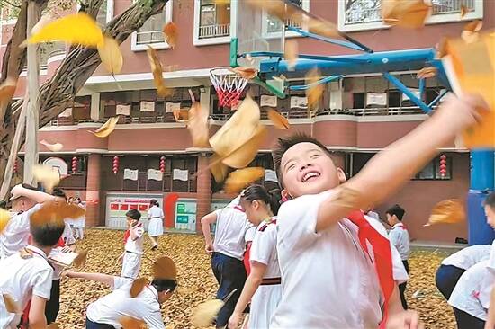 一向干净整齐的校园,为何“落叶不扫”?谈及初衷,朝天小学党支部书记、校长孔虹表示,每年这一时段都是榕树换叶时节,往年由于天气潮湿等原因,会利用孩子们不在校园的时间打扫干净。上周五,她看到孩子们在树下玩落叶玩得很开心,“我就想起他们还没有见过校园里满地金黄的样子,于是特意嘱咐清洁工周末先不打扫。”