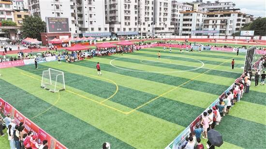 文/图 赖嘉华 6月15日至16日,2024广东梅州“农商银行·李惠堂杯”五人足球争霸赛(球王争霸赛)长乐烧·五华站在五华县体育场举行。 8支球队以球会友 “咚咚锵,咚咚锵……”15日下午,随着激昂的鼓点声响起,精彩的舞狮表演拉开了开幕式表演的序幕。紧接着,省级非遗五华竹马舞、客家山歌五句板、网红表演等节目轮番上演,吸引了众多游客、当地市民前来欣赏。 “现场气氛特别好,梅州人一如既往爱看球、爱踢球。”当地市民李学文带着两个孙子前来看球。他介绍,自己小时候就特别喜欢踢球,现在带孩子来看球,希望他们能喜欢上足球这项运动。 精彩表演过后,裁判员、各参赛代表队迈着矫健的步伐进入比赛场,本次比赛共有梅州三和、五华元坑、惠堂乡泉、华南菲特尔、城南食府、叶塘温泉、深圳嘉兴、一缕光等8支球队参加比赛,他们将在两天比赛中角逐出五华站冠军。 据了解,梅州大力发展社会足球、群众足球、草根足球,推动“足球+”社会经济发展。本次赛事是梅州举办面向全国开放报名的五人制足球赛的第二年,去年在梅州市体育局精心策划打造下,顺利开展了首次面向全国的李惠堂杯五人足球争霸赛,营造了浓厚的人民足球氛围,取得良好的社会效果。 首站比赛冠军队伍决出 16日下午进行的两场半决赛踢得异常激烈,对阵双方势均力敌,两场都只能通过点球大战分出胜负。最终,叶塘温泉和梅州三和分别战胜深圳嘉兴和元坑足球,顺利会师决赛。 临近决赛开场时,现场下起了雨,但阻挡不了球迷们看球的热情,他们撑着伞在场边早早等候。越接近开赛,前来观赛的村民和球迷就越多,很快便将球场围得水泄不通。 16日晚,经过前期的激烈角逐,长乐烧·五华站决赛正式打响。叶塘温泉和梅州三和上演精彩激烈的进球大战,最终叶塘温泉以6:3大胜对手,夺得长乐烧·五华站冠军,梅州三和获亚军,两队都喜提一头黑山羊。叶塘温泉另获10000元及名优特产作为奖励,该队球员范海乾获得“草根球王”称号。同时,两队都将获得参加总决赛的资格。 颁奖现场上,头戴大红花的黑山羊活蹦乱跳并发出咩咩叫声,试图摆脱身上的绳索,队员显得无可奈何,索性把山羊抱在怀里,这滑稽的一幕也惹得全场忍俊不禁。