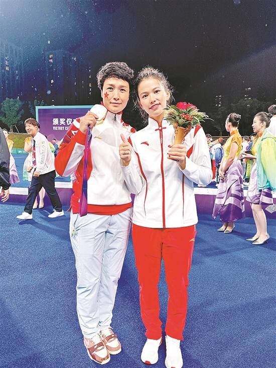 杭州亚运会夺冠后,钟嘉琪(右)与教练范淑芳(左)合影 受访者供图 |