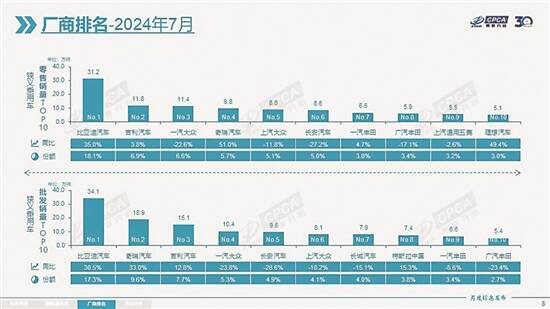 具体来说,7月乘用车环比增速下降2%,是近期最小降幅。市场价格拐点出现,恶性价格竞争苗头被抑制。主流自主车企持续走强,新势力表现分化,新能源车国内零售渗透率达到51.1%,实现首次月度突破50%,较去年同期36.10%的渗透率提升15个百分点。7月一共卖了87.8万辆新能源车,而燃油车只卖了84.2万辆,实现首次月销量超越。