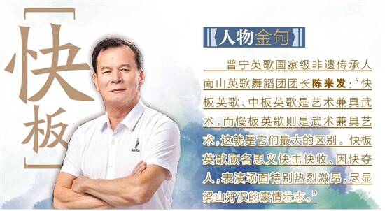 随着紧密的鼓点落下,队员身着短打衣,配合默契,手中的短棒快速而有力地挥舞,动作整齐划一,短棒的敲击声和有力的脚步声交织,“呦哈”人声与“咚咚锵”鼓音融为一体,尽显热烈激昂。这场面,让人仿佛穿越时空,置身于梁山好汉的豪情壮志之中。 2024年初,普宁南山英歌舞队作为快板英歌的卓越代表,受邀赴英国伦敦参与欢乐春节活动,还将普宁英歌的魅力“发射”至南非开普敦。近日,羊城晚报记者来到普宁南山英歌传承基地,寻访国家级非遗传承人、广东揭阳普宁南山英歌舞蹈团团长陈来发,深入感受快板英歌的魅力。 经典竖击槌打法,快而不乱因快夺人 作为土生土长的南山人,陈来发自幼耳濡目染,对英歌有着浓厚的兴趣,18岁时,陈来发就加入了南山村少年英歌队练习,至今已有50年。如今,他已是普宁英歌国家级非遗传承人,也是普宁快板英歌的第九代传承人。 南山快板英歌之所以独具魅力,在于其招式、形式都有着独特之处。“快板英歌、中板英歌是艺术兼具武术,而慢板英歌则是武术兼具艺术,这就是它们最大的差别。”陈来发谈到,快板英歌是以单提手单提脚方式进行表演,使用长37厘米、直径3厘米短棒,干脆有劲、十分抢眼。 据陈来发介绍,在招式上,南山英歌是竖击槌打法的代表,快板英歌所用木槌较短、较细,槌的击法灵活多变,动作套式也比较多,其中还有双人、四人对击槌的变化,队形变化丰富,一般由时迁执蛇舞动在队前引导或在队中穿插。风格特色是快而不乱、动中求静、手到眼到、槌槌有力、快击快收、因快夺人,十分强烈地表现出英雄们舍生忘死、冲锋陷阵的战斗情景,气势磅礴、振奋人心。 当下,南山快板英歌已有超过300年历史,每个南山人都以英歌为荣。“深深扎根于潮汕民间土壤的英歌舞是潮汕人民不可缺少的精神食粮,是潮汕文化不可分割的一部分。人民创造了它,人民需要它,这是英歌在几百年来得到传承延续,生生不息的最根本原因。”陈来发表示。 大胆创新让英歌舞队从广场走向舞台 因时而变,随事而制。1992年,南山英歌队应邀参加在天津举行的广场艺术邀请赛,陈来发也以此为契机突破了快板英歌以往固有的表演形式。 陈来发回忆道:“我考虑到,如果按照以往在广场表演的编排模式,队员上场后就会围成一个圈,这样部分队员就会背对着评委观众,观感不好。”因此,陈来发带头大胆改编了英歌舞的表演队形,正是这一创新发掘了快板英歌更多可能性,为英歌舞开拓了新表演场地,也将英歌舞从广场推向舞台。 与此同时,陈来发深知传承与变革相辅相成,他认为,改进不是摒弃传统,而是在保留核心价值的基础上,让英歌适应现代社会的审美和需求。现今,英歌舞紧跟新时代不断进步,在这个过程中,他提出自己坚持的原则:创新不变味。 “英歌舞应该创新,但不能变味,要与流行舞曲区分开,祖先留下的传统要原汁原味,更多重心放在提高动作要领上”,陈来发说道。 为更好传承原汁原味的快板英歌,今年暑假,陈来发在普宁南山英歌文化传承基地举办英歌舞公益培训班,吸引了100多名青少年加入。陈来发表示,举办这个培训班主要是让更多的人来了解普宁英歌舞的传统,了解非遗文化,使我们古老的传统舞蹈文化不会丢失。