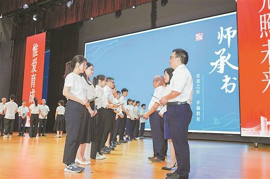 羊城晚报讯 记者郑明达摄影报道:“学生初涉杏坛,有幸拜您为师,未来定当遵纪守规、铭记教诲、爱生如子、孜孜不倦……”8月21日,教师节前夕,深圳市福田区教育局举办了一场别开生面的拜师活动,695名新入职教师进行宣誓,标志着他们正式成为福田教育的新生力量。 在这场主题为“师徒结对‘传帮带’,青蓝同心‘大先生’”的拜师活动中,新教师们向107位福田区优秀校长、教师代表呈递拜师帖,表达他们对教育事业的热忱和对未来职业生涯的期待。 师父们也用心且工整地写下回帖,不仅寄予了殷切期望,也为新教师们的人生新阶段送上深切祝福。他们承诺将毫无保留地传授经验,引领新教师持续探索、不断进步。 师徒结对“传帮带”是福田区推动教师队伍高质量发展的重要举措,也是教育传承的优良传统,这一举措不仅让优秀教师作为师父传授经验,也鼓励年轻教师分享自己的新技术、新方法,实现双向交流、共同进步。 在福田区教师发展中心的组织下,今年入职的695名新教师依据自身学科,全部加入到107个省、区级名师工作室和研修坊,组成福田教师学习共同体。