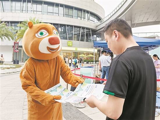 工作人员身着人偶服现场派发“空杯减塑”宣传页 |