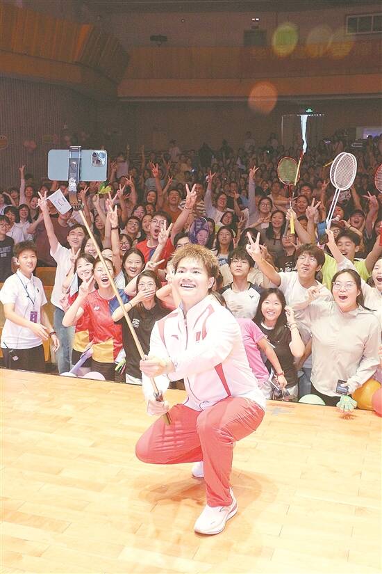 活动现场,气氛十分火爆,梁伟铿的到来引起全场阵阵欢呼,不少同学拿起手机拍照留念。在互动环节,梁伟铿还与同学们来了一场球技切磋,让现场师生近距离目睹奥运健儿的风采。