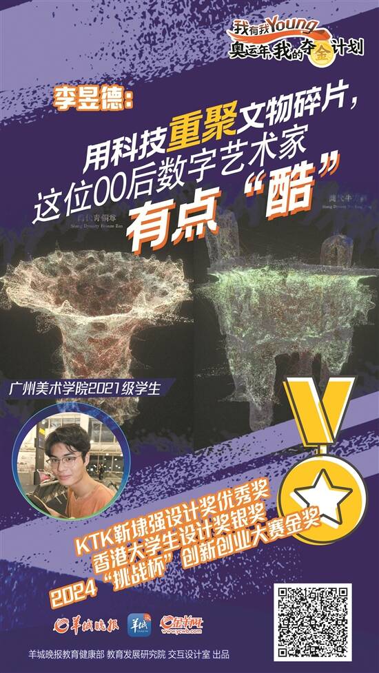 羊城晚报记者 李可欣 【人物档案】 李昱德 广州美术学院2021级学生 KTK靳埭强设计奖优秀奖 香港大学生设计奖银奖 2024“挑战杯”创新创业大赛金奖 “我做这个项目的初衷,就是觉得‘这样做很酷!’”来自广州美术学院艺术与科技专业的21级学生李昱德给出了一个颇具00后跳脱风格的答案。今年,李昱德独立创作的多个以文物为蓝本的数字艺术作品在社交平台上赢得关注,接连被央视等媒体报道。新学期伊始,他带着对艺术的热爱与对传统文化的敬畏,规划着属于自己的“夺金计划”。 用数字技术照亮文化 在李昱德的作品中,我们不难发现他对传统文化的热爱与传承。从《文物的重塑》到《佛光再现》,他用数字艺术的方式,让古老的文物焕发新生,也让观众在科技的魅力中感受到传统文化的厚重与美丽。在电视节目中,他的作品让嘉宾赞叹不已。 “文物只是与历史长河中存在的刹那见证,残缺不是不完美,而是等待另一种形式的重聚。”在创作《文物的重塑》时,李昱德被广州南汉二陵博物馆中破碎的陶片所触动,萌生了用数字艺术让文物“重聚”的想法。他通过编程程序,用红线将破碎的文物重新连接,用粒子的形态聚合,正如古往今来交织的时光与人文,不仅展现了技术与艺术的结合,更传递了他对传统文化的解构与重构。 “技术为观念的表达提供了工具和手段,而观念则为技术的应用和发展指明了方向。”在谈及技术与文化的关系时,李昱德有着自己独到的见解。他认为,数字艺术作为一种新兴的艺术形式,具有独特的优势和潜力,能够在传承和发展传统文化方面发挥重要作用。通过现代技术手段,传统文化可以得到重新诠释,焕发新的生命力,并通过互联网和社交媒体迅速传播到世界各地。 如今,李昱德的小红书账号拥有五千多位粉丝,获赞与收藏3.4万,被网友亲切地称呼为“双吉老师”。他曾说“真挚的情感表达”是作品的核心创作理念,而他的“真挚”也切切实实地在网络上引起了共鸣。在评论区,不乏有网友对于作品发出自己对传统文化的新思考。 新学年的“夺金计划” “樊振东在乒乓球男单四分之一决赛中,凭借卓越的技术和顽强的意志力,最终实现了反超并赢得胜利。他强大的意志力给我留下了非常深的印象。”谈及奥运冠军对自己的影响,李昱德的话语中透露出满满的敬佩之情。 “成功不仅仅依靠技术,更需要坚定的信念和顽强的意志力。”李昱德坦言,樊振东的坚持与拼搏,让他意识到在艺术创作中,同样需要这种不屈不挠的精神。“当我心里想去达成一个目标时,这种信念就会在心里扎根,哪怕结果一时不如人意,我也不会轻易放弃。”他表示,正是这份信念,让他在艺术创作的道路上不断突破自我,追求极致。 随着新学期的到来,李昱德也为自己制定了详细的“夺金计划”。他深知,艺术之路漫长且艰辛,但只要坚定信念,勇于挑战,就一定能够取得成功。 “目前我手头上有几个关于自然主题的数字艺术创作,我的目标就是将他们完成好。”在谈及新学期的创作计划时,李昱德显得格外专注。他希望通过这些作品,进一步探索自然与艺术的关系,用数字艺术的方式展现大自然的壮丽与和谐。 除了创作计划外,李昱德还对自己的职业规划有着清晰的认识。“我希望未来能够开拓更多的传统媒介与数字艺术的结合方式,最终建立一个以自己IP为主的可持续数字文化发展生态。”他表示,希望通过这种方式为传统文化的传承与发展做出更大的贡献。 在谈及如何实现这些目标时,李昱德显得既自信又坚定。“放手去做就是最具体的努力。”他说,“我相信只要坚持不懈地努力下去,就一定能够实现自己的梦想。”