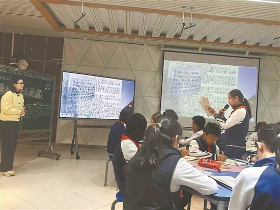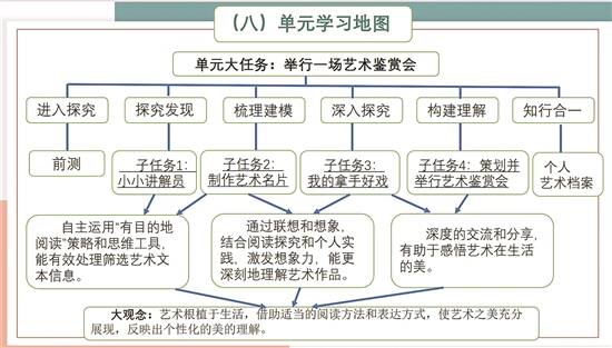 “我们将这两个单元统领在‘艺术让生活更美好’的主题下,整合开发形成‘举行一场艺术鉴赏会’的单元大任务。”校长陈武介绍,将教学内容和课外拓展内容设计为讲解、制作艺术名片、展示自我才艺、艺术鉴赏会等四个子任务,最终形成个人艺术档案,让学生完成探究、发现、深入探究、构建理解、知行合一的深度学习过程。