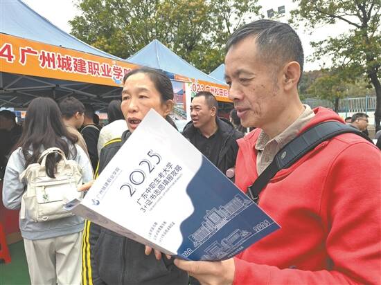 3月9日上午,广州市纺织服装职业学校举行的职教高考咨询会现场,学生和家长在各高校摊位前了解升学信息 |
