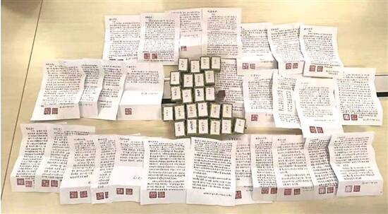 翁先生根据妻子遗愿,选用石料,对照医院值班表名单刻了26枚姓名章,每一枚章除了姓名之外,还在另一头刻了“仁心仁术”“吉祥如意”“大爱无疆”等字,另附26封手写致谢信。他在信中解释说,医护人员给予了无微不至的关心照顾,刻章既是对医务人员付出的称赞,也是祝愿他们一生平安幸福、吉祥如意。