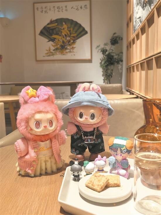 来自西安的李小姐告诉记者,她“入坑”泡泡玛特仅半个月,消费已接近一万元。有时在官方渠道未能买到心仪款式,便会通过闲鱼平台或直播间溢价收购。“最初是被它们可爱的颜值吸引,一方面,符合多数女性对‘小萌物’的喜爱心理,另一方面,拆盒、愿望达成的过程,能提供情绪价值。”尤其钟爱LABUBU系列的她特意在卧室布置了一个小角落,用来陈列买回来的搪胶毛绒公仔,并为它们购置娃衣、帽子、头饰,精心打扮一番,甚至会随身带着出去吃饭、逛街、工作。
