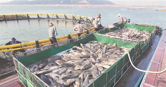 渔民在网箱边收鱼 曾柯权 摄 |