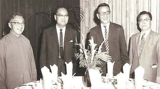 1963年,容启东先生(右二)和新亚书院创校校长钱穆(左)、香港中文大学副校长李卓敏(左二)、联合书院校长郑栋材(右)合影 |
